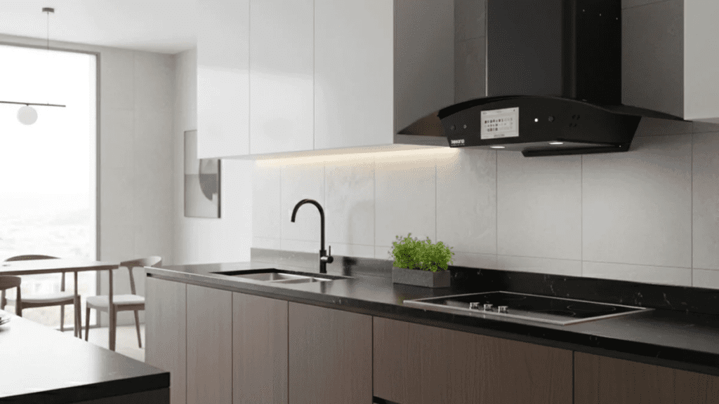 - Under-Cabinet LEDs: Use high-CRI (Color Rendering Index) LED strips to highlight the texture of the backsplash beneath the hood, making the black finish “pop” against the illuminated tile.