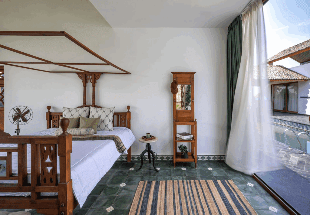 The best part is the bedrooms which are situated in a private wing, which are joined by a serene foyer. Each of them opens up to greeneries or a serene courtyard, providing an impeccable indoor-outdoor harmony. And those stunning four-poster beds? They bring a sophisticated, vintage element to the design that works so well with the local aesthetic.