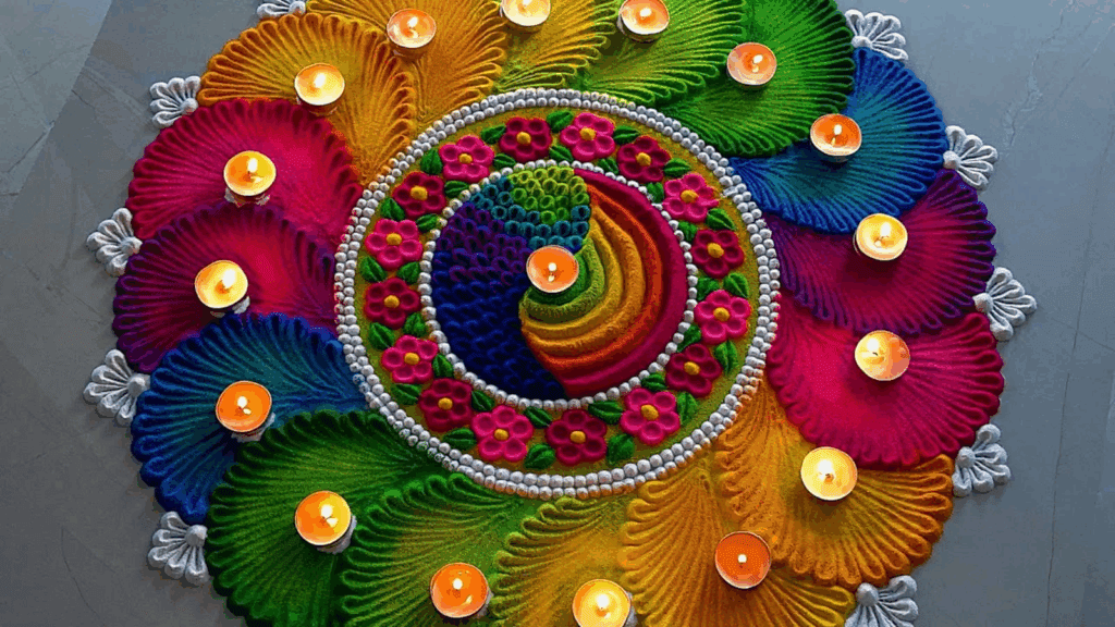 Rangoli is lovely in itself—but with diyas, it is a masterpiece.