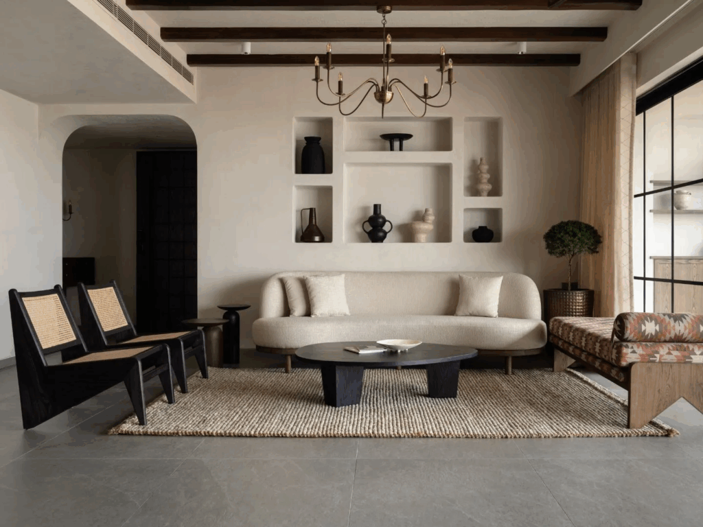 The open balcony carries this vibe on: “part-tropical hideout, part-industrial sanctuary.” With landscaping by Navneeth Kumar and furniture from Beruru, Curio Casa, and Purple Turtle, it’s a hidden garden in the air—lush, relaxed, and ideal for entertaining.
