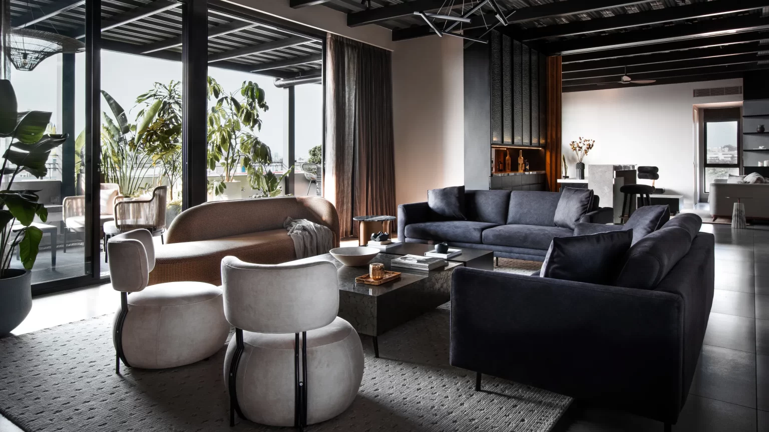 Commissioned by Balan + Nambisan Architects, the 5,500-square-foot, two-storey penthouse has views of the airport on one side and a golf course on the other. Right from the beginning, the owners—the young, liberal, and adventurous couple—had given their architects a free hand to create something entirely expressive. That freedom led to dramatic decisions: vaulted ceilings with exposed black steel, raw deck slabs, and even black ceramic tiles in the kitchen.