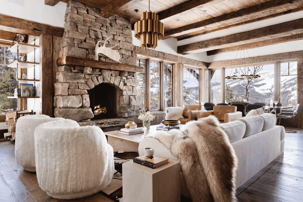 - Natural materials: Wood and stone are essential. From wide-plank floors to oversized fireplaces, these materials bring the outdoors in.