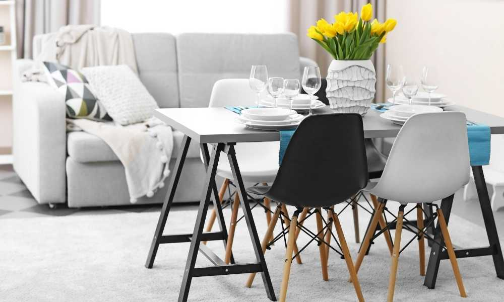 Choose pieces that showcase the material, not the design. Think clean-lined tables, straight-backed chairs, and simple cabinetry that lets wood grain or metal patina shine.